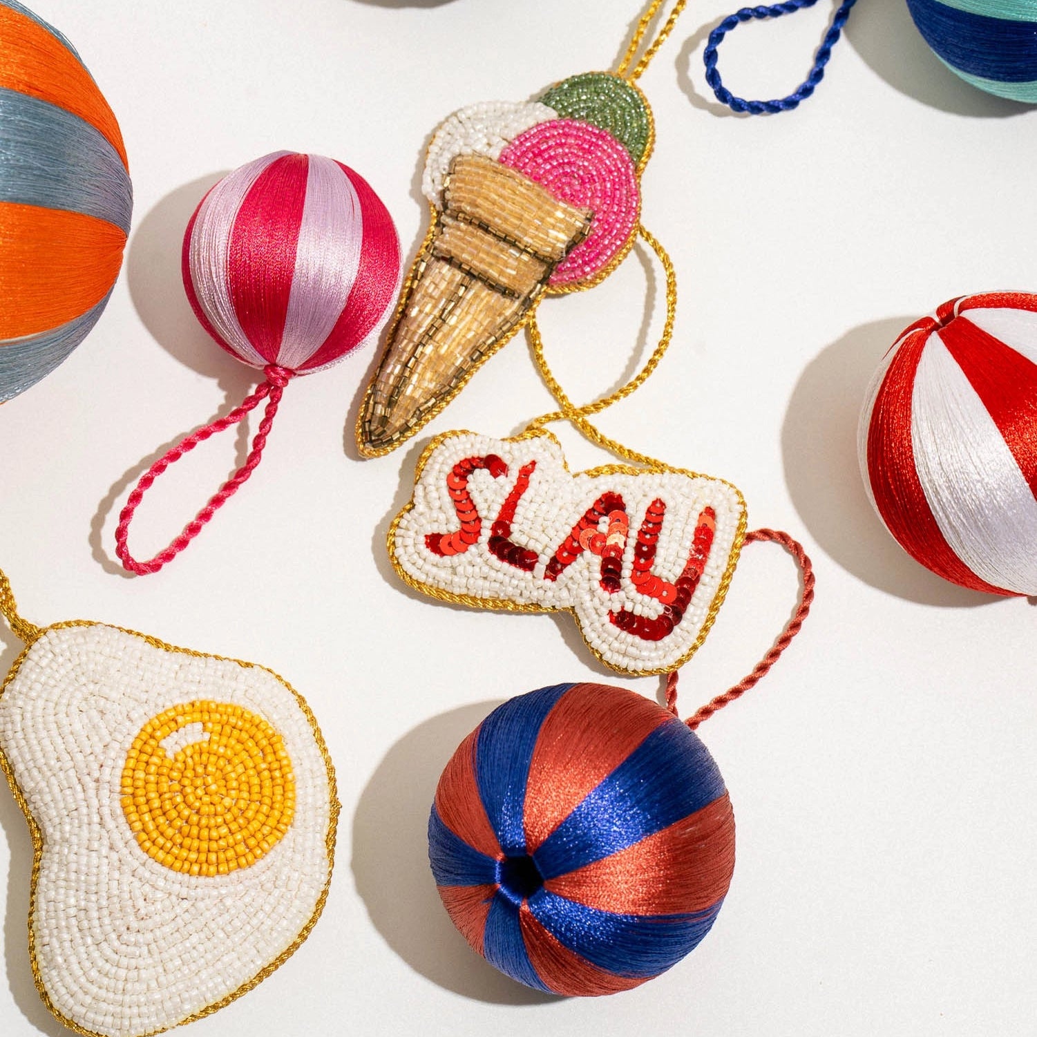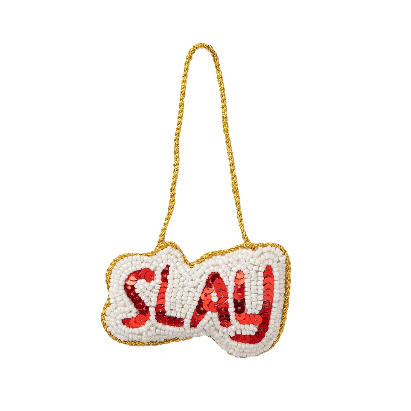 Hand-embroidered 'Slay' Christmas decoration, featuring white glass beads, red sequins, and a gold rope edge detail.