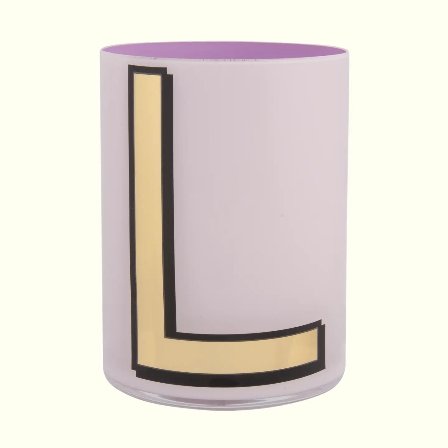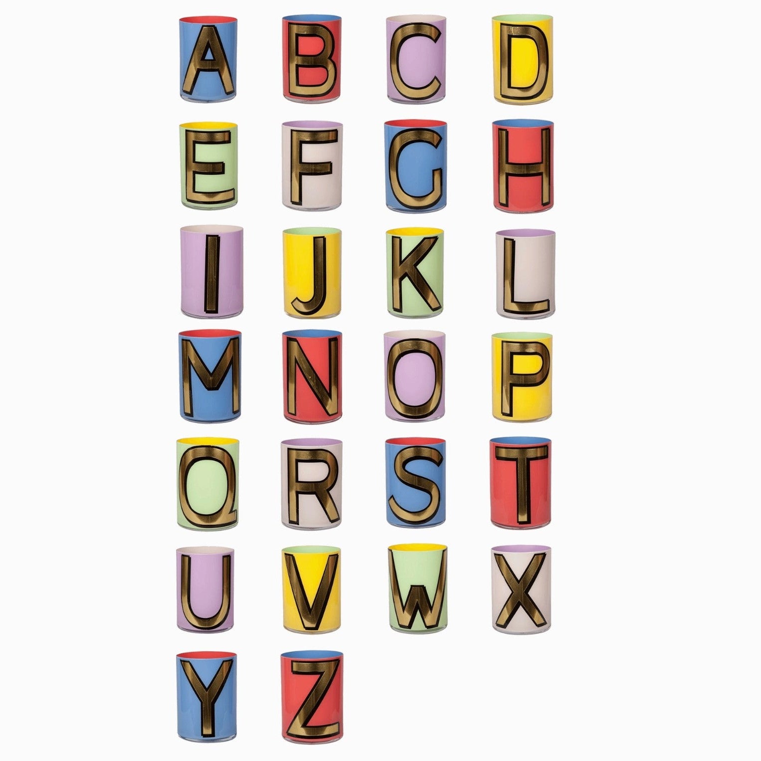 The Bridie Hall brush pots are smooth glass tumblers, inlaid with a gold vinyl letter or symbol, backed with different coloured lacquers and a topcoat of glossy varnish.