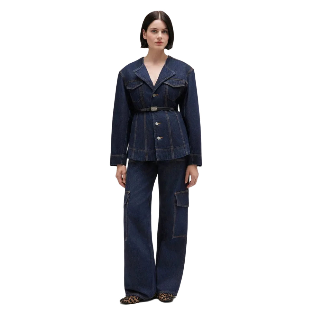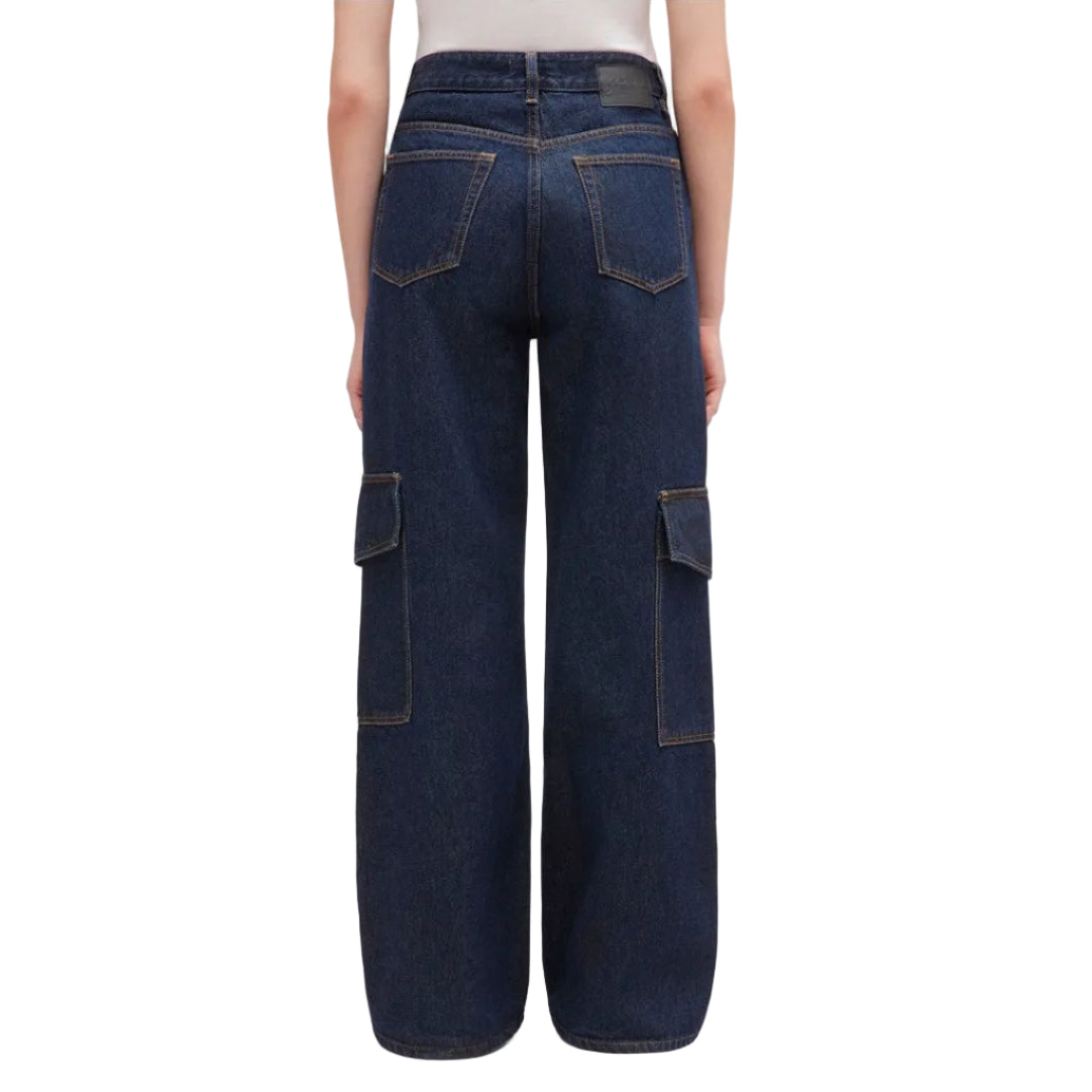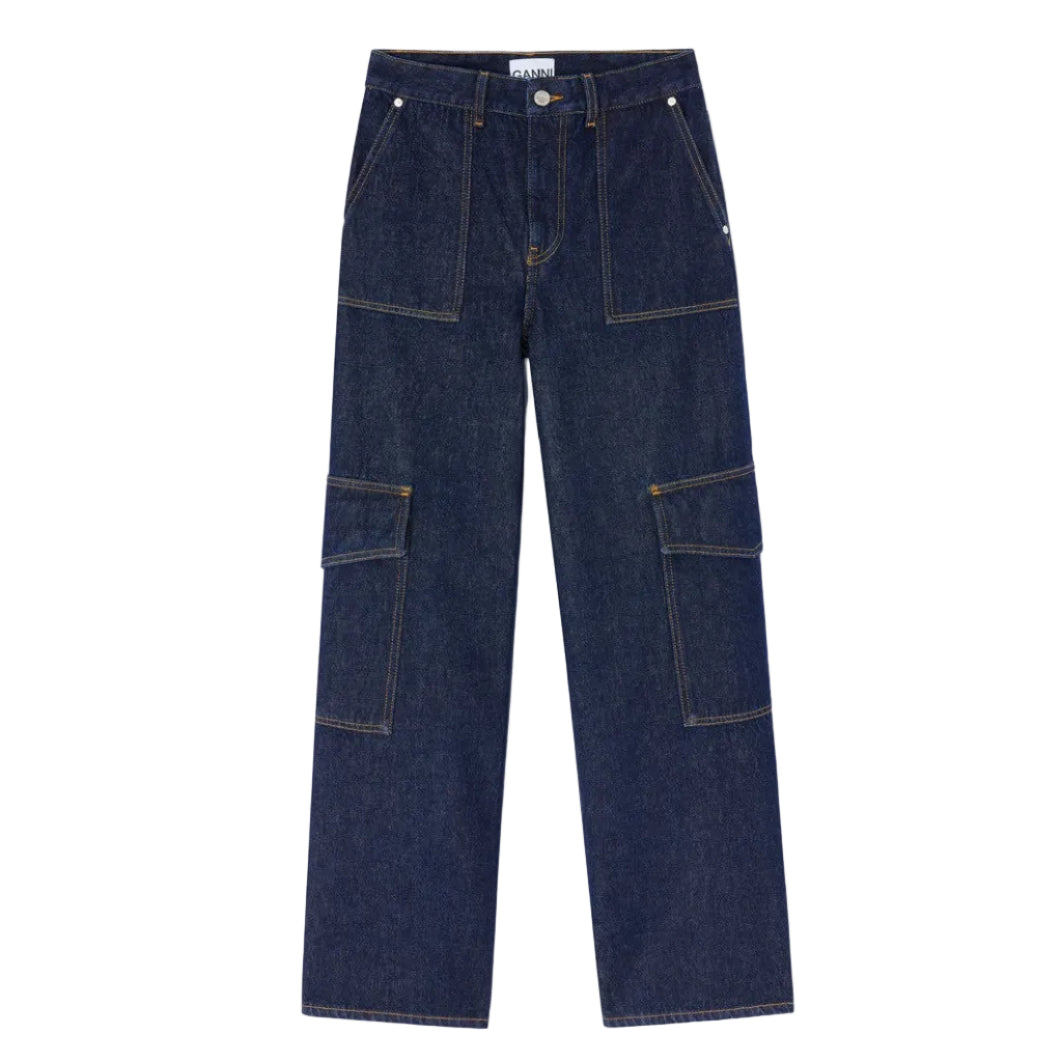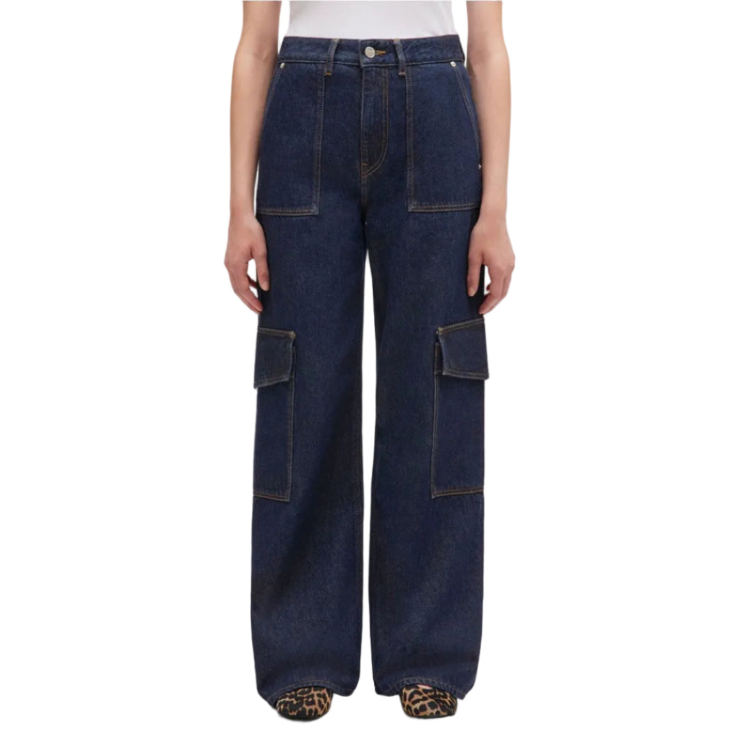 The Angi jeans by GANNI are a high-rise, full length, straight leg jean with a zip-closure, side pockets, and cargo pocket detailing at the lower leg.  Crafted from dark blue rigid non-stretch denim, giving the style a raw denim look.