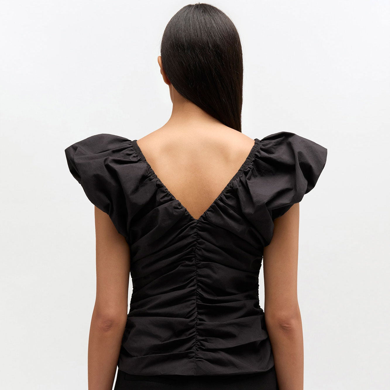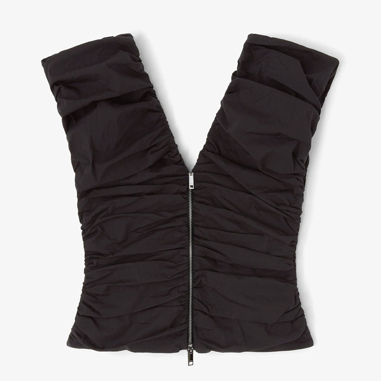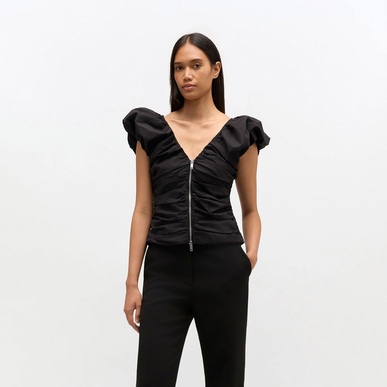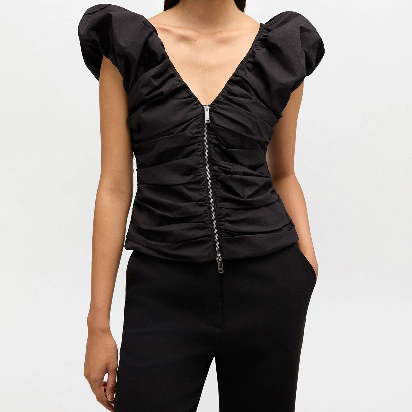 This ruched sleeveless top by GANNI features a flattering v-neckline, two-way zip closure, and ruching along the bodice.