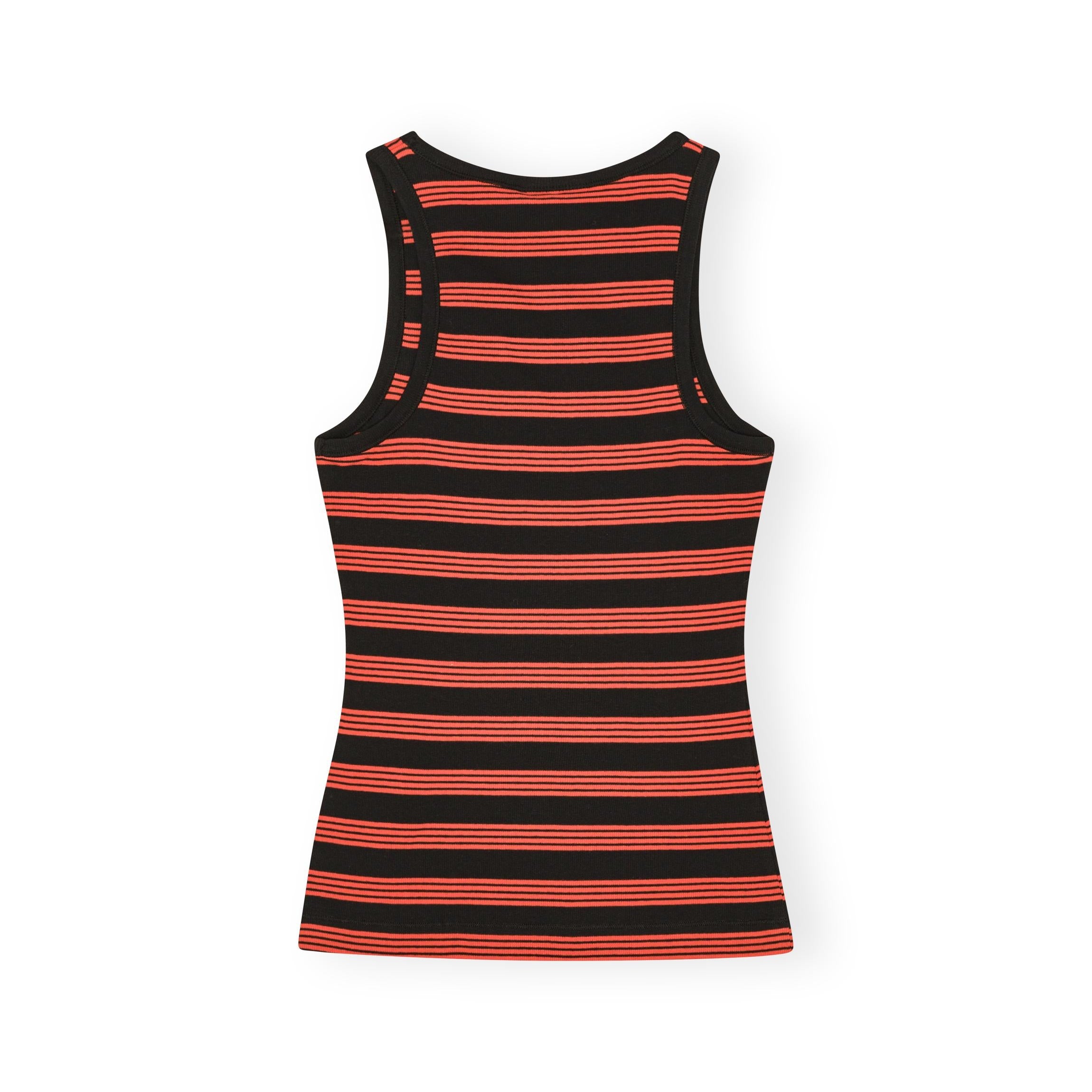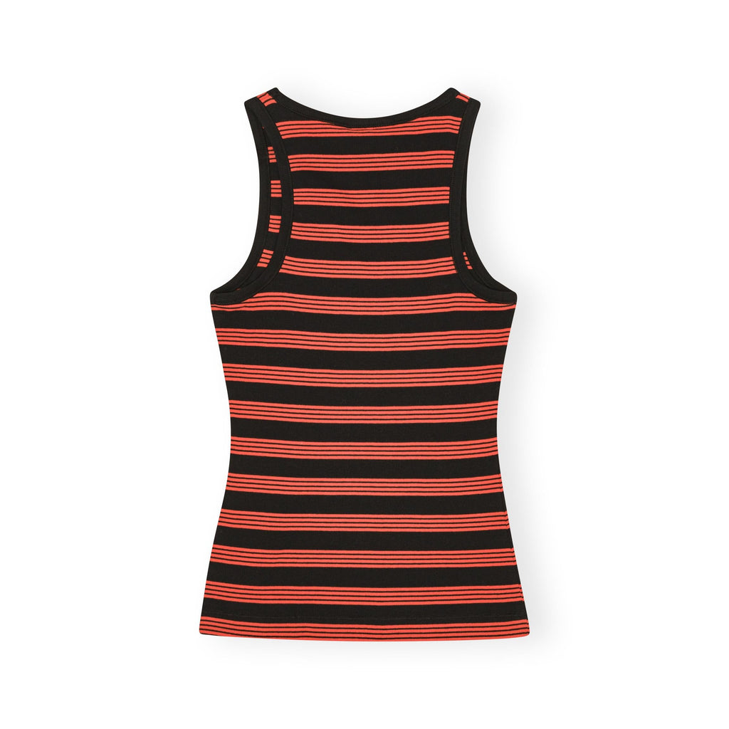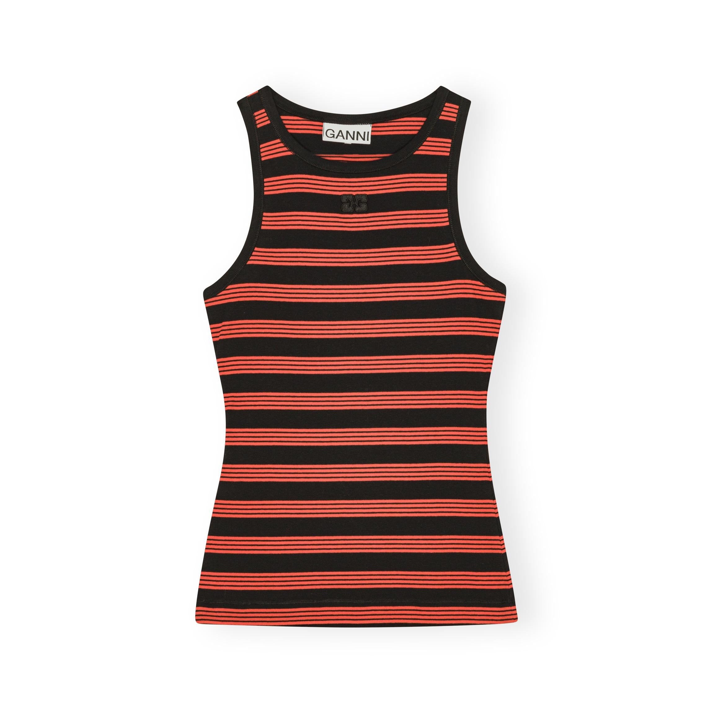 GANNI's soft cotton ribbed tank top in red and black stripe - featuring a round neckline, a tone-on-tone embroidered GANNI Butterfly logo, and a racer-style back.