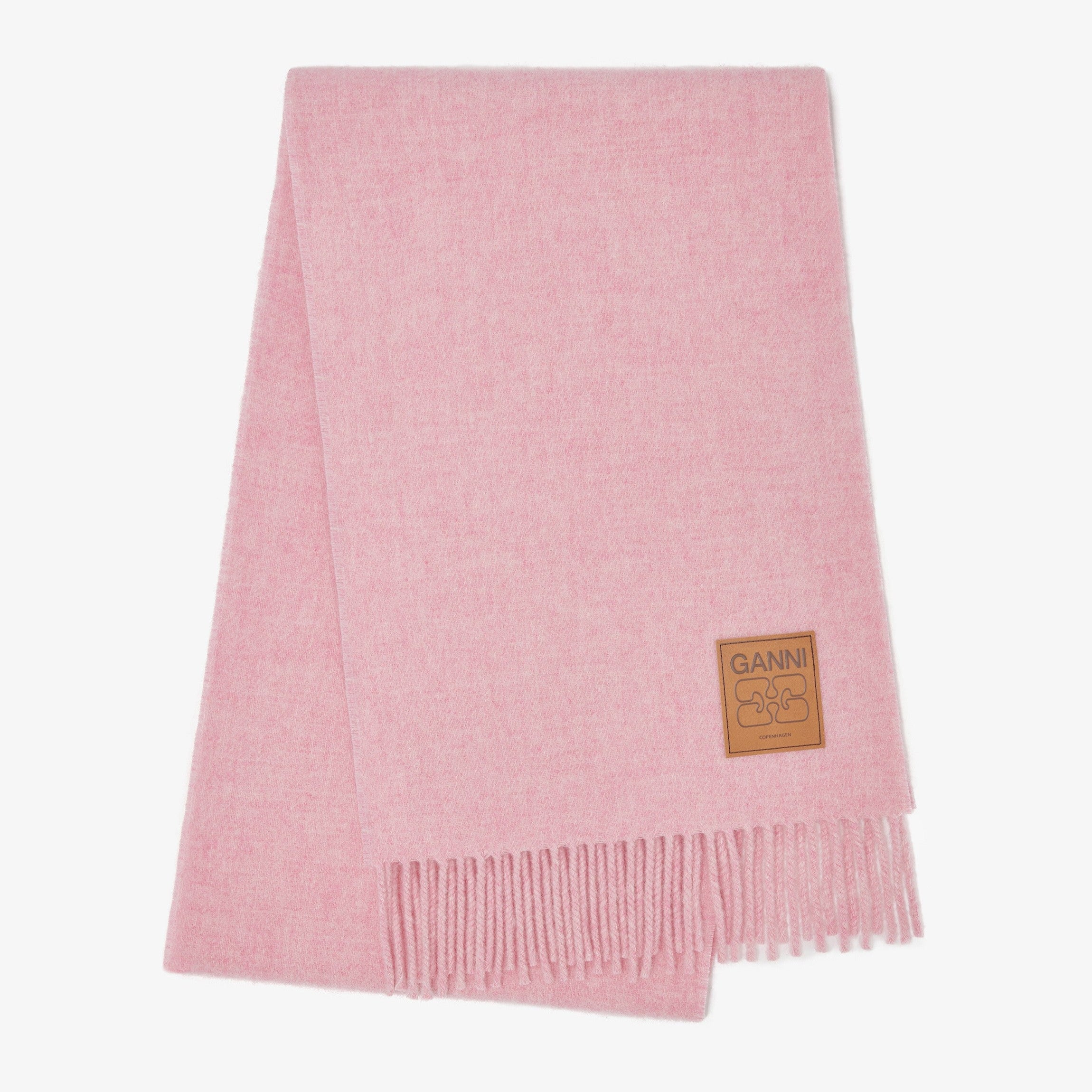 GANNI woollen scarf featuring fringed edges and a GANNI logo patch.