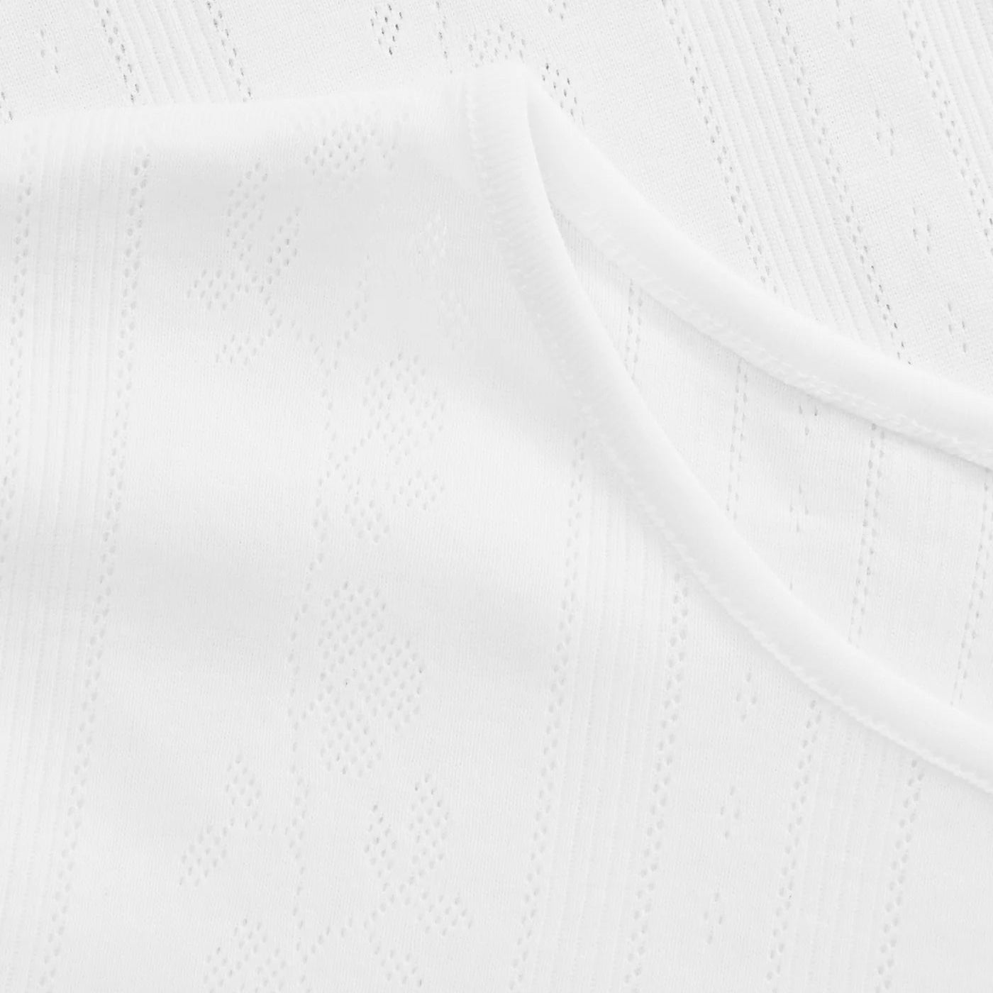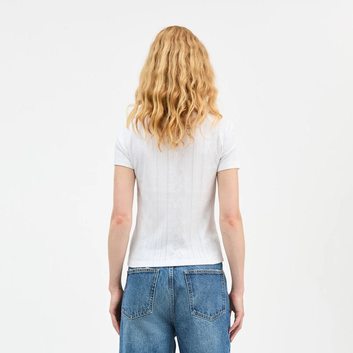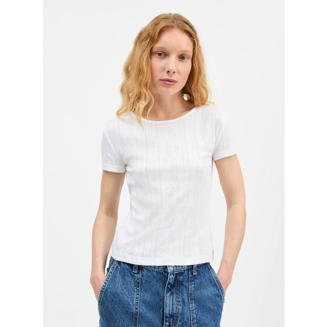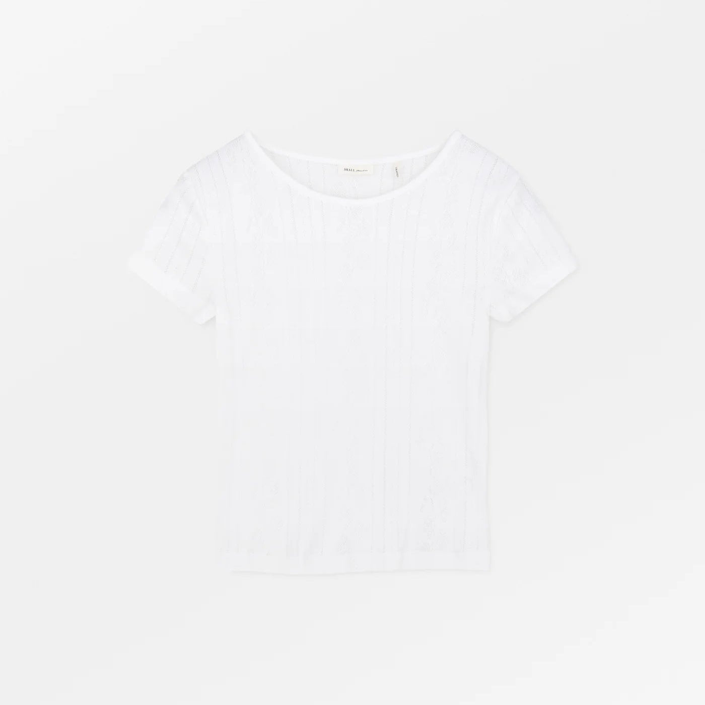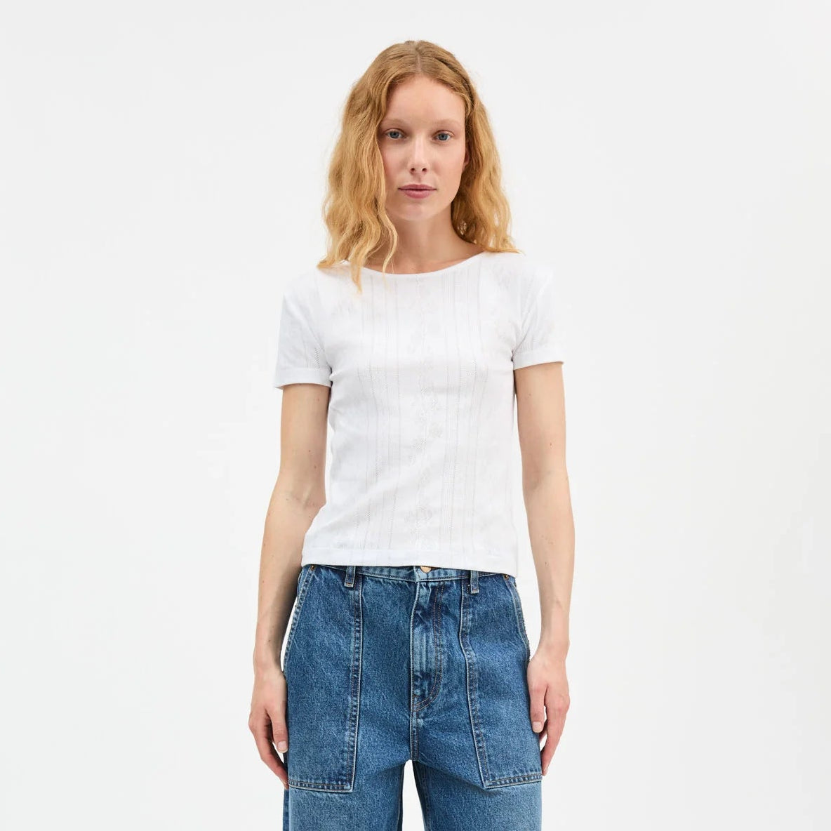 Made from 100% GOTS certified organic cotton jersey, the Anna cap sleeve tee by Skall Studio is a soft cotton T-shirt with floral pointelle texture and cap sleeves.