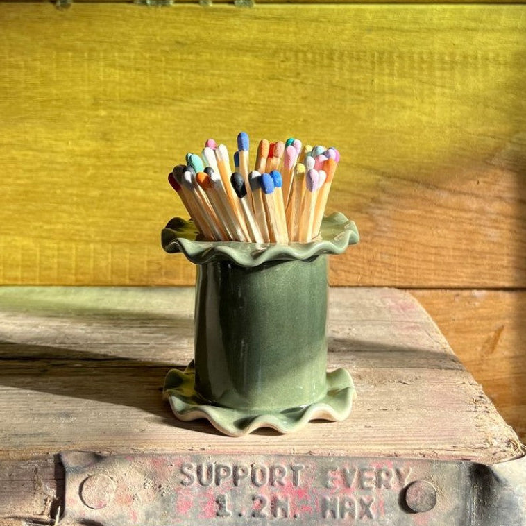 Superfluities have hand crafted the most beautiful ceramic match holder, featuring a double frill, and a circular striking pad on the underside.