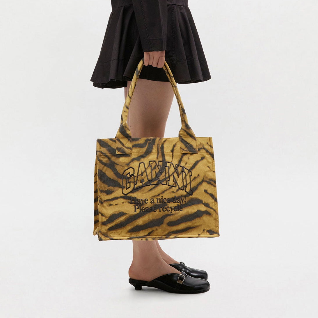 GANNI zebra print tote bag featuring top handles, one large compartment, a zipped inside compartment, and a GANNI logo with the phrase 'Have a nice day! Please recycle' on the front in black embroidery.