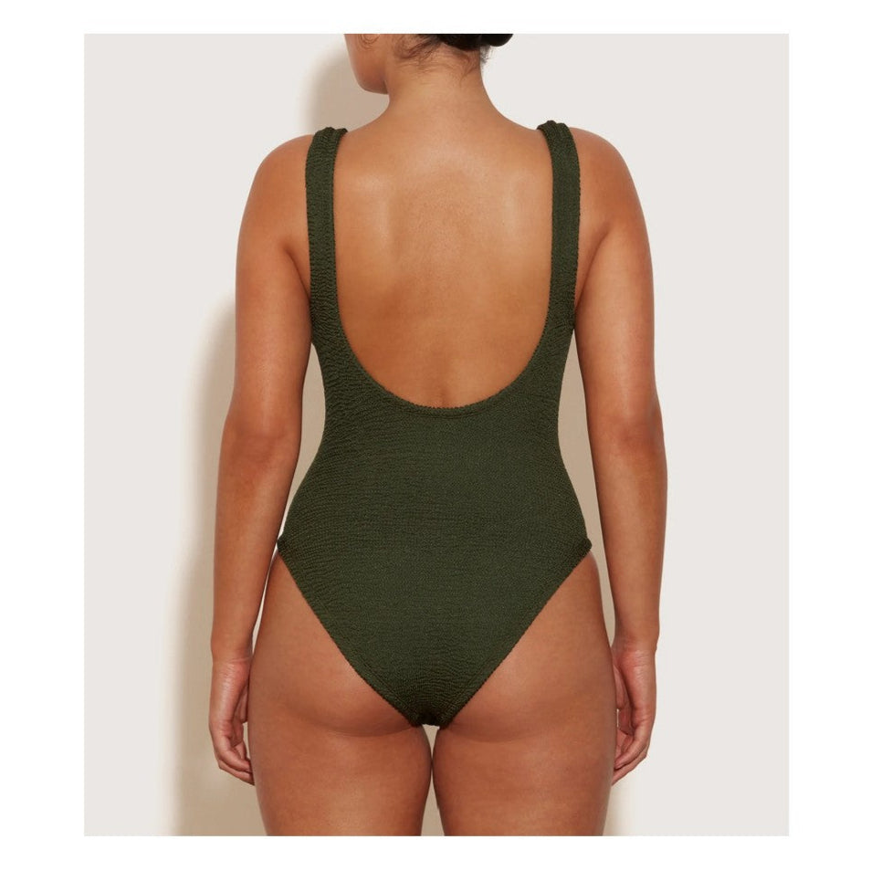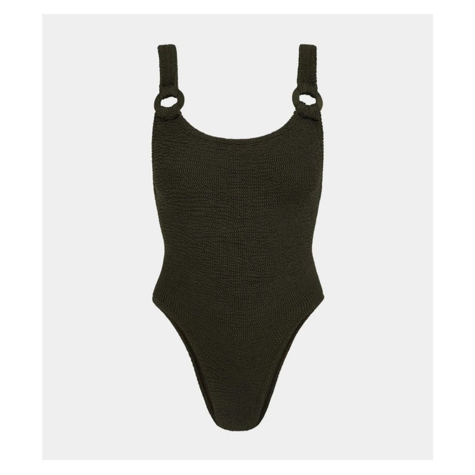 Hunza G's iconic dipped neck, scooped back Domino swimsuit, now reimagined with chic tonal hoop detailing. A modern take on an old friend.