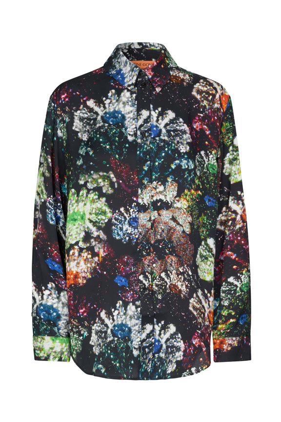 THE SOPHIA SHIRT IS A STRAIGHT CUT BUTTON UP WITH A LOOSE SILHOUETTE, WIDE FIT LONG SLEEVES WITH SUBTLE CUFFS, AND A VIVID FLORAL PATTERN.